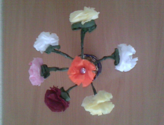 Предлагаемая работа стала подарком на юбилей воспитателю нашей семьи в детском доме. Дети с удовольствием принялись за работу, чтобы частичка их труда осталась на долгую память. Во время нашей совместной работы с детьми над поделкой, мы прослушивали запись детских песен. Для работы понадобятся: -салфетки (разного цвета) ; (обязательно зеленого цвета для стебелька и чашелистика) -проволока (устойчивая, не тонкая) -бусинки или красивые пуговицы -баночка для вазы (у нас из-под кофе) -ножницы -клей Складываем салфетку 2 раза пополам - вырезываем круг (обвожу фломастером на салфетке круг, дети вырезывают по контуру, затем протыкаю сама (чтобы дети не поранились) в середине круга шилом дырочку для стебелька, просовываю проволоку не большой длины и на проволоку нанизываю бусину или пуговку для сердцевины цветка. Потом конец проволоки высовываем обратно и закручиваем на основание будущего нашего стебелька. Наш цветок уже не «рассыпится». С остальными действиями дети легко справляются сами. Нарезаем полоски зелёной салфетки (детям легче полоски накрутить вокруг проволоки, чем большую салфетку) . Чашелистик делаем так: расправляем салфетку и простригаем на 4части, берём карандаш и закручиваем на него салфетку до середины, концы сжимаем гармошкой, вытаскиваем карандаш. Чашелистик промазываем клеем и закручиваем под цветком. Делаем не большие надрезы по кругу будущего цветка для пышности. Теперь осталось только поставить цветы в вазу. Можно оставить в таком виде, а можно в вазу залить разведенный гипс или положить пластилин и воткнуть в него наши цветы, тогда они устойчивые, не падают друг на друга. (Вазу предварительно мы обклеили красивой салфеткой) Цветы в вазе готовы. Спасибо за внимание. | |